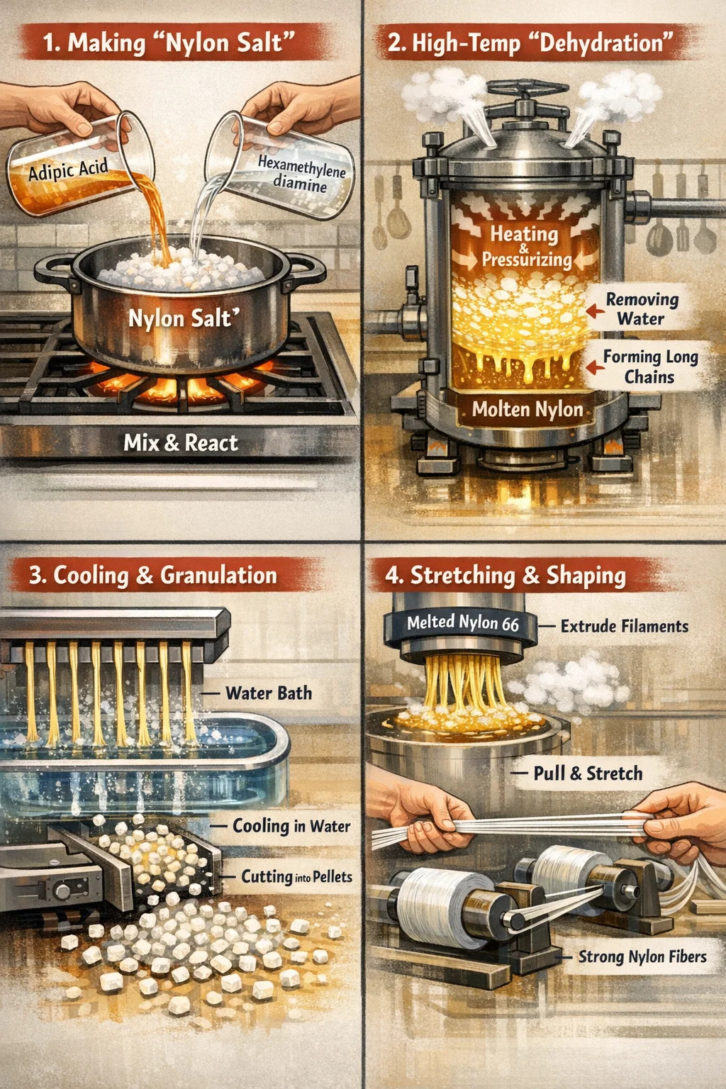 Proprio come per la preparazione dell'acqua salata, la fabbrica mescola prima due materie prime principali (acido adipico ed esametilendiammina) in acqua. Queste due materie prime reagiscono per formare una sostanza cristallina bianca, comunemente nota come "sale di nylon".