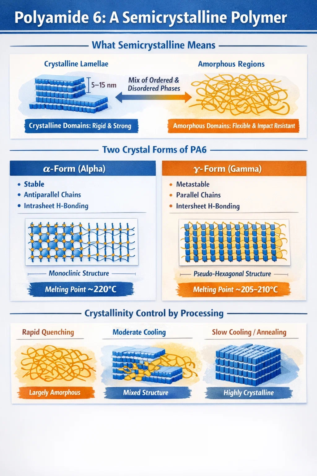Un malinteso comune è che il PA6 sia "cristallino" o "amorfo" a seconda di come viene lavorato. In realtà, la proporzione di ciascuna fase cambia con le condizioni di lavorazione, la storia termica e il contenuto di umidità, ma entrambe le fasi sono sempre presenti in una certa misura nella poliammide 6 solida. Il PA6 raffreddato con quench può avere un indice di cristallinità basso fino a pochi punti percentuali, mentre il materiale raffreddato lentamente o ricotto può raggiungere circa il 35%. Nessuno dei due estremi produce un materiale che sia puramente una fase o l'altra.