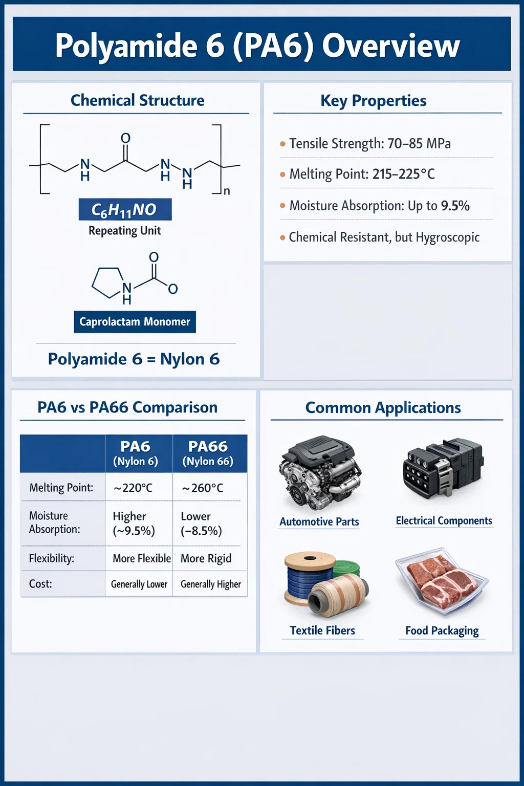 A livello globale, la poliammide 6 è uno dei materiali termoplastici tecnici più consumati. Il volume di produzione annuale supera 4 milioni di tonnellate , e il materiale è parte integrante di settori che vanno dall'automotive all'elettronica, al tessile e all'imballaggio alimentare. Comprendere cosa rappresenta PA6 è solo il punto di partenza: la sua chimica, le caratteristiche prestazionali e il comportamento di lavorazione definiscono il motivo per cui è diventato così dominante dal punto di vista commerciale.