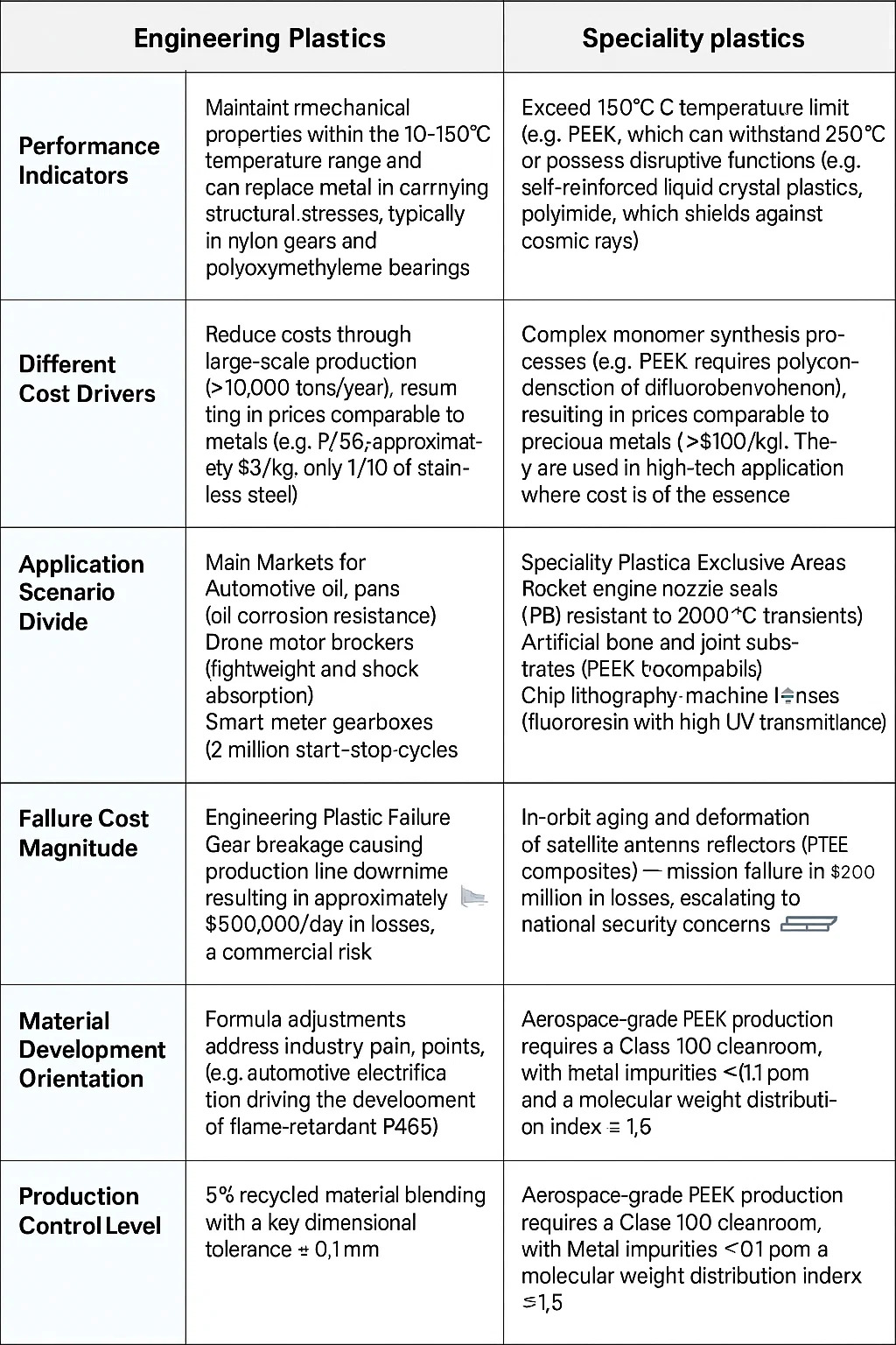 Plastiche speciali: processi complessi di sintesi di monomeri (ad esempio, il PEEK richiede la policondensazione del difluorobenzofenone), con conseguenti prezzi paragonabili a quelli dei metalli preziosi (>$ 100/kg). Vengono utilizzati in applicazioni ad alta tecnologia in cui il costo è essenziale.