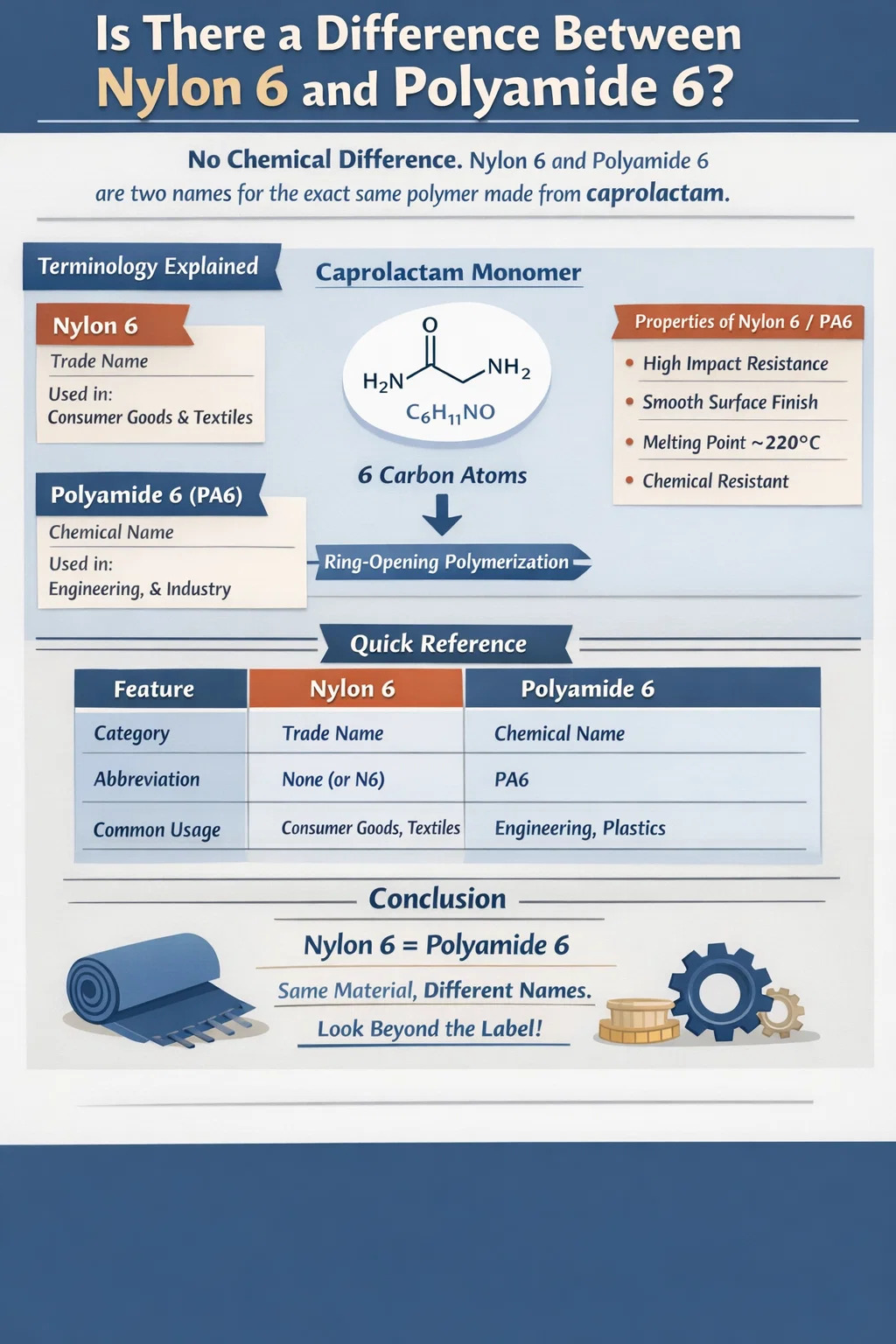 Per dirla semplicemente: non esiste alcuna differenza chimica tra Nylon6 e Poliammide 6. Sono due nomi diversi per lo stesso identico polimero. "Nylon" è il noto nome commerciale oiginariamente coniato da DuPont, mentre "Poliammide" è il nome chimico formale utilizzato nella scienza e nell'ingegneria. Quando vedi Nylon6 sull'etichetta di un prodotto di consumo e Poliammide 6 in una scheda tecnica si riferiscono allo stesso materiale costituito da monomeri di caprolattame.